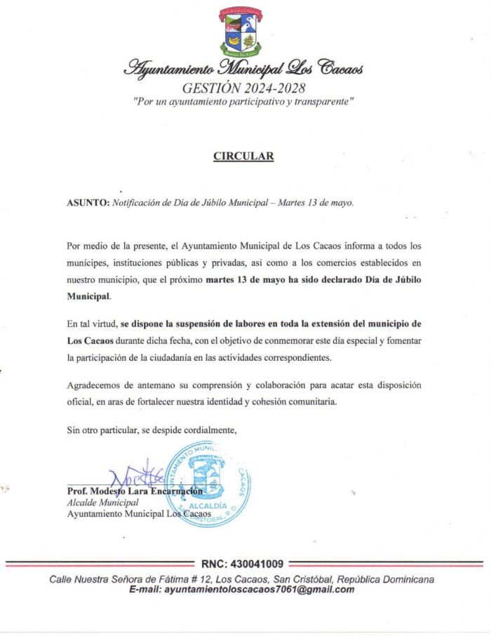 Los Cacaos, San Cristóbal- En la sesión 003-2018 fue declarado como día del Regocijo municipal el 13 de mayo en Los Cacaos San Cristóbal, por celebrarse las fiestas patronales en honor a nuestra patrona “Nuestra Señora de Fátima”. Por dicha razón el día 13 del mes en curso, es un día feriado para nuestro municipio y por ende un día no laborable.